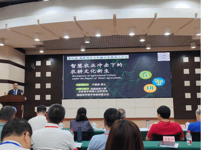 2025年9月20日,我院台籍教师、市场营销系副教授卢翊淮博士,受闽江学院乡村振兴研究院邀请前往参加第四届海峡两岸乡村融合发展闽江论坛,并做了《智慧农业冲击下的农耕文化新生》主讲发言。本届论坛由闽江学院主办,闽江学院乡村振兴研究院、厦门大学台湾研究院承办,中评智库基金会、闽江学院海峡两岸融合发展研究院、经济与管理学院协办。