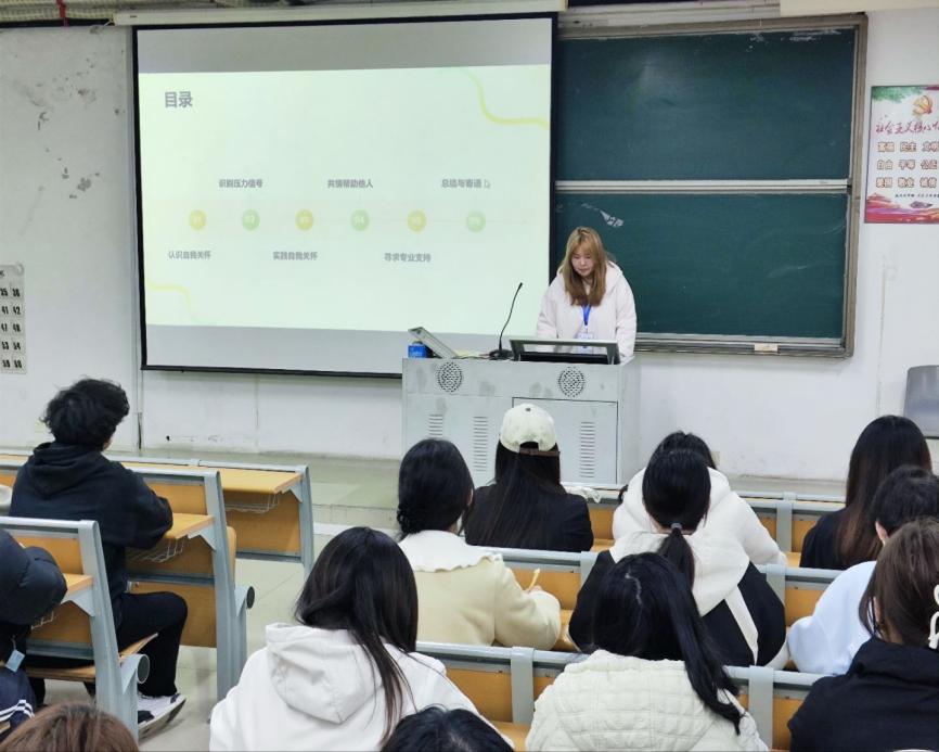 培训伊始,主讲人从“什么是自我关怀”入手,指出自我关怀并非自私,而是持续服务他人的基石。它包含善待自己、共通人性和静观当下三个核心层面,就像手机需要充电一样,心理委员也需要不断为自己“充电”,才能稳定、有效地支持身边的同学。